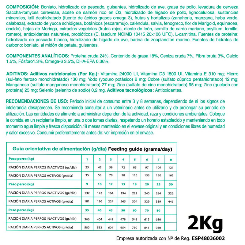 Boniato, hidrolizado de pescado, guisantes, hidrolizado de ave, grasa de pollo, levadura de cerveza Saccha-romyces cerevisae, aceite de salmón rico en Omega 3, Hidrolizado de hígado de pollo, lignocelulosa, sustancias minerales, krill deshidratado (fuente de ácidos grasos Omega 3, frutas y hortalizas (zanahoria, manzana, haba verde, calabaza) hojas de Moringa, extractos vegatales, E. faecium NCIMB 10415 20×106 UFC), L-carnitina. Fuentes de proteína: hidrolizado de pescado blanco, hidrolizado de hígado de ave, harina de zooplancton marino. Fuente de hidratos de carbono: boniato, almidón de patata, guisantes.