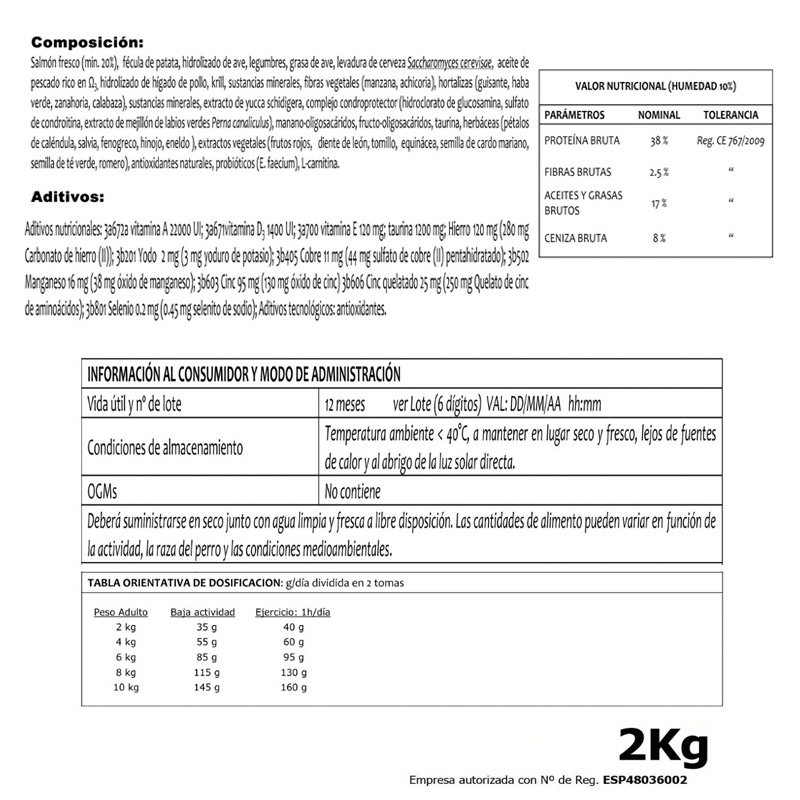 Salmón fresco (min. 20%), fécula de patata, hidorolizado de ave, legumbres, grasa de ave, levadura de cerveza Saccharomyces cerevisae, aceite de pescado rico en Omega 3, hidrolizado de hígado de pollo, krill, sustancias minerales, extracto de yucca schidigera, complejo condroprotector (hidroclorato de glucosamina, sulfato de condroitina, extracto de mejillón de labios verdes Perna canaliculus), manano-oligosacáridos, fructo-oligosacáricos, taurina, herbáceas (pétalos de caléndula, salvia, fenogreco, hinojo, eneldo), extractos vegetales (frutos rojos, diente de león, tomillo, equinácea, semilla de cardo mariano, semilla de té verde, romero) antioxidantes naturales, probióticos (E. faeciu), L-carnitina.