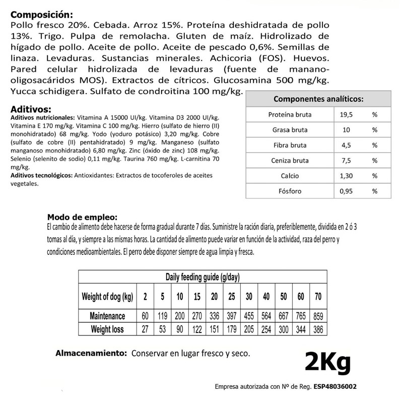 Pollo fresco 20%. Cebada. Arroz 15%. Proteína deshidratada de pollo 13%. Trigo. Pulpa de remolacha. Gluten de maíz. Hidrolizado de hígado de pollo. Aceite de pollo, Aceite de pescado 0,6%. Semillas de linaza. Levaduras. Sustancias minerales. Achicoria (FOS). Huevos. Pared celular hidrolizada de levaduras (fuente de manano-oligosacáridos MOS). Extractos cítricos. Glucosamina 500 mg/kg. Yucca schidigera. Sulfato de condrotina 100 mg/kg.